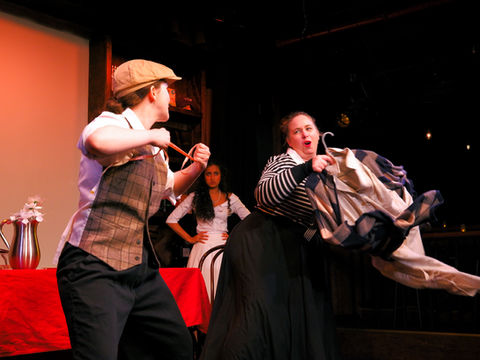 This one-hour, sitcom-style staging of Shakespeare's controversial comedy was presented as part of Arachne Theatre's summer season at Caveat NYC. This production leaned into the dark aspects of the central storyline, contrasting the gradual defeat of a women's spirit to resist with an upbeat tone and soundscape, including an inescapable laugh track. The final moments of the show are depicted as a loss for both Katherina and her husband, as he comes to realize a quietly submissive woman was never what he truly wanted, leaving both of them at a loss brought on by the way patriarchy forces both men and women to reshape themselves.